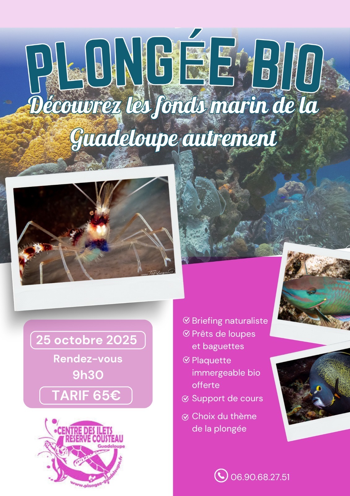 Dimanche 12 Octobre 2025 : GRANDE PREMIÈRE – Sortie double plongée sur des nouveaux spots – Tous niveaux – Petit déjeuner et collation – Rendez-vous 6h45. I Samedi 25 Octobre : Plongée Bio – Rendez-vous 9h30